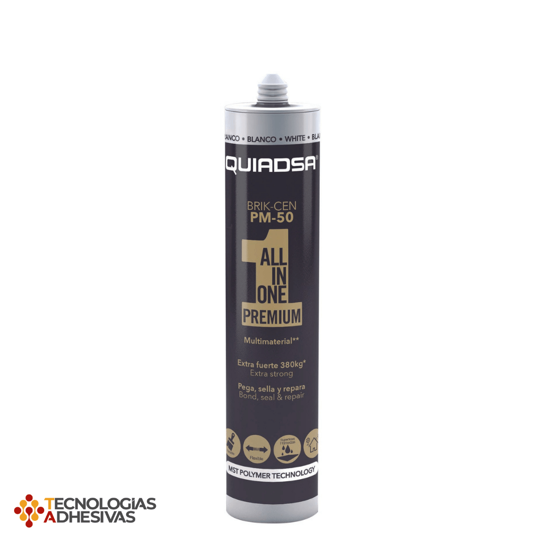 Adhesivo y sellador híbrido de un solo componente con mucha flexibilidad, a base de poliuretano salinizado, libre de siliconas, isocianatos y solventes. Elasticidad permanente, no amarillea, cambia de color y no se contrae al curar. Disponible en colores negro, blanco y gris.